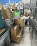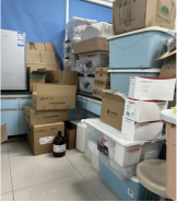 C334室纸箱堆积于通道和走廊;C328室试剂桶未合理摆放且无标签