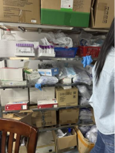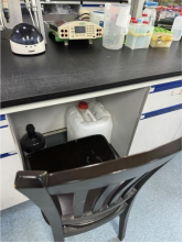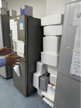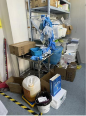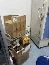 C413-2室冰箱旁堆放泡沫箱;废液瓶及实验用料瓶罐未放置相应位置