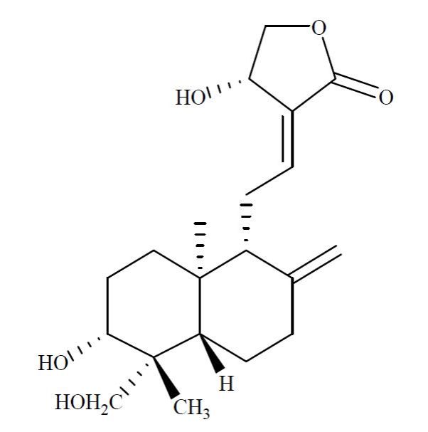 性味苦,寒。归心、肺、大肠、膀胱经。具有清热解毒,凉血,消肿的功效。多用于感冒发热,咽喉肿痛,口舌生疮,蛇虫咬伤等症。原产于印度半岛和斯里兰卡,在东南亚国家具有悠久的民间用药历史,是具代表性的大南药之一,现代药理研究表明,穿心莲中的二萜内酯类成分穿心莲内酯(图2),具有抗炎、抑菌、抗病毒、抗肿瘤、保肝利胆、保护心血管系统与神经系统等多种药理活性。