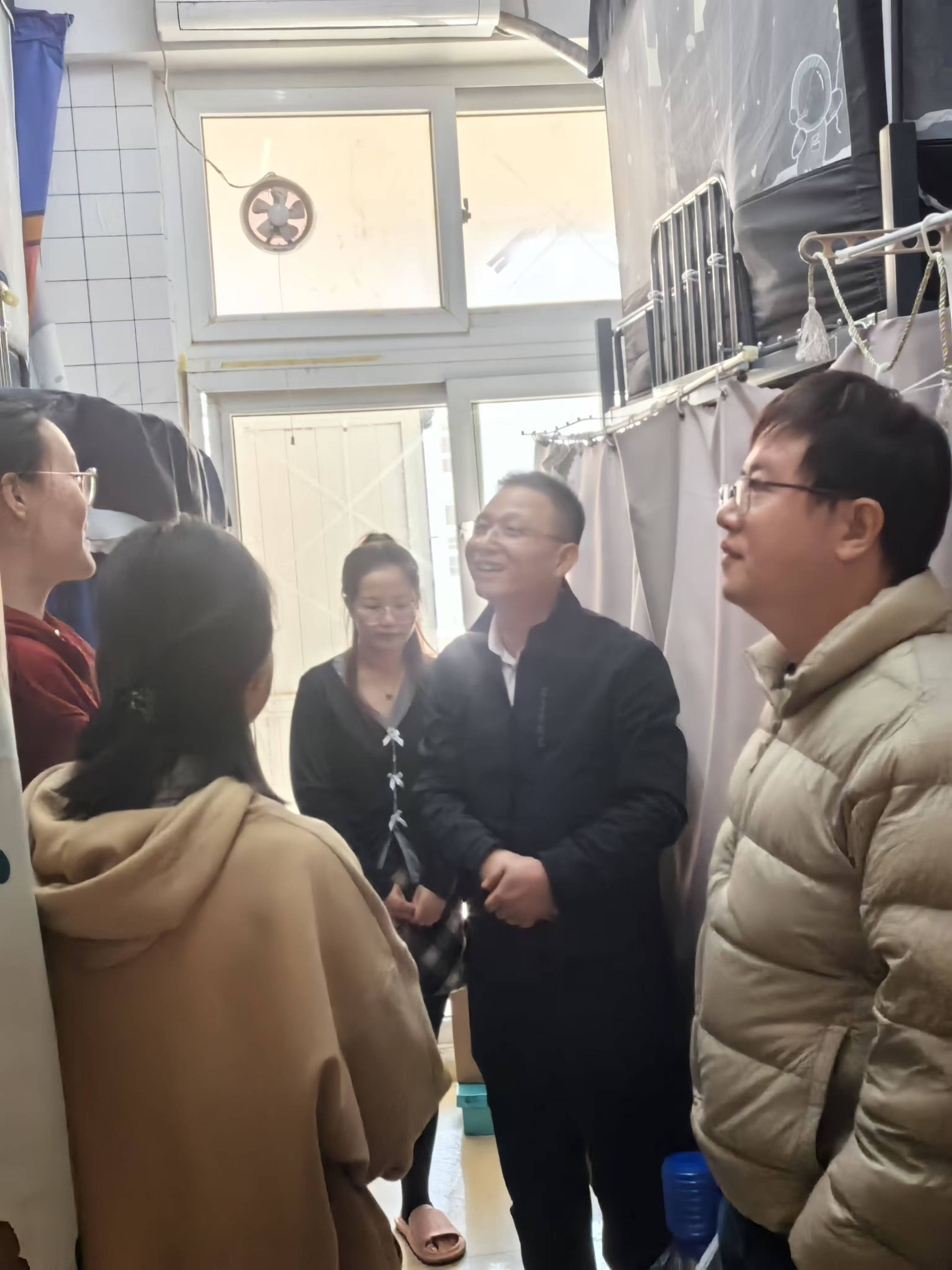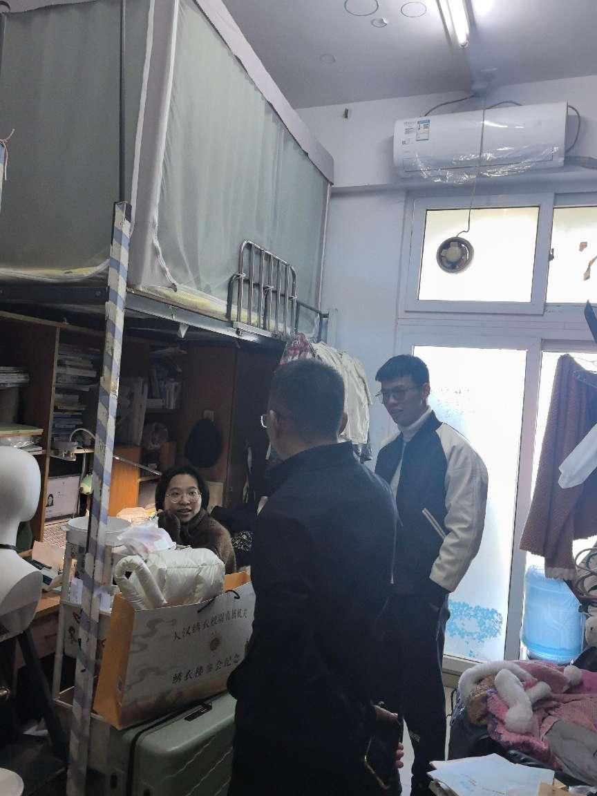 踏入宿舍区,老师们与同学们展开了亲切交流。王建刚尤为关心同学们的生活与学业状况,他与学生拉起了家常:“最近天气转冷,要注意保暖”“复习进度怎么样呀?”“寒假有什么打算”“取暖要注意用电安全”……同时,王建刚认真检查宿舍的安全、卫生等情况,对发现的问题,及时提醒同学们整改。