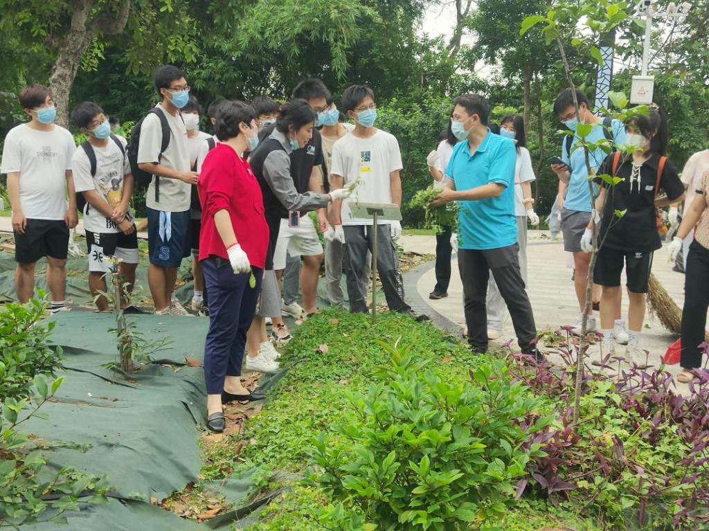 劳动课伊始,老师和同学们以小组为单位划分责任田,积极进行除草劳动。大家分工明确,有的负责铲除杂草,有的负责打扫清理,不放过任何死角,忙的不亦乐乎。随后,彭光天老师带领师生,一起进行药用植物的学习和辨识,详细讲解每种植物的功效和药用价值,并结合自身参加野外资源普查的实践经历,分享了学习药用植物的相关经验。药用植物奇特的命名和功效成功吸引了老师和同学们的兴趣,聚精会神听讲的同时,时不时向彭老师请教自己心中的疑惑,现场其乐融融,一片欢声笑语。