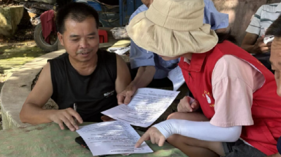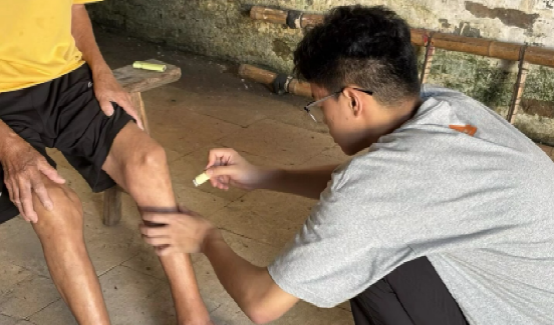 伴随着晨光,健康服务组的成员们顺着蜿蜒小路前往白洞新村和白洞旧村,继续为当地村民提供推拿、艾灸、贴耳穴和量血压等医疗保健服务。在服务之余,村民们也会和组员们用粤语拉上两句家常话,这份淳朴感情和奉献精神的双向奔赴让组员们感受到此行的意义。