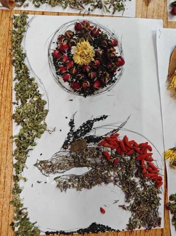 最后一堂课,干枯的药植突然“活”了!薄荷当草、玫瑰作花,芝麻铺成蝴蝶的翅膀,枸杞拼出孔雀的眼眸,还有一条用多种药材“拼”成的“中药龙”,一亮相就惊艳了全场。原来中药不仅能治病,还能变魔术——这堂拼画课,把中医药文化的浪漫刻进了童心。