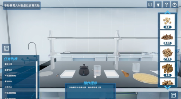 通过高自由度模式制作实验场景,模拟香砂养胃丸的实验室制备过程。在虚拟实验室场景中通过交互操作,实现药材配方的抓取、煎煮、粉碎过筛、制丸等全过程的操作,同时结合视频操作教学,帮助学生可以更加直观和快速的学习整个制备过程。