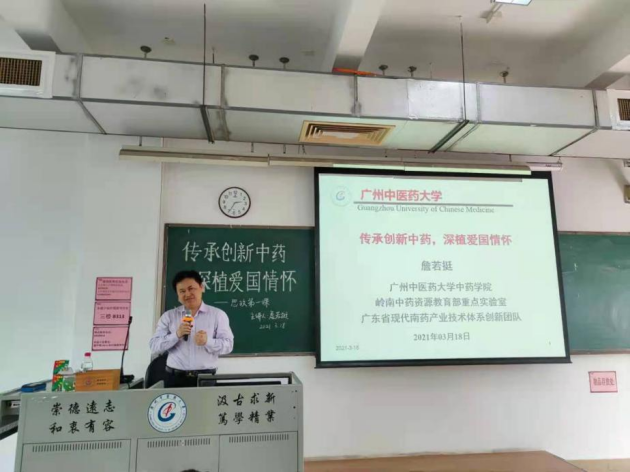 詹若挺院长本次讲授分为四个部分展开。首先以青蒿素获得诺贝尔奖为例子,分析了中医药的传承与发展的现状与趋势,并结合自己的学习和工作经历,向同学们阐述了中医药发展的美好前景;随后从我国中药产业的快速发展、新冠抗疫中的“三药三方”研发与应用、广东中药产业的发展创新等方面,向同学们详细介绍了我国我省蓬勃发展的中药产业;并用详实的数据、丰富的图片向同学们展示了广东南药传承与创新方面的实践情况;最后詹院长以全国政协委员唐江澎在2021年“两会”“委员通道”上的讲话(“好的教育应该是培养终身运动者、责任担当者、问题解决者、优雅生活者”)为引,结合同学们的专业背景,勉励同学们利用好专业优势资源,挖掘自身的特长特色,努力学习知识,增长技能,深植爱国情怀,增强使命担当。